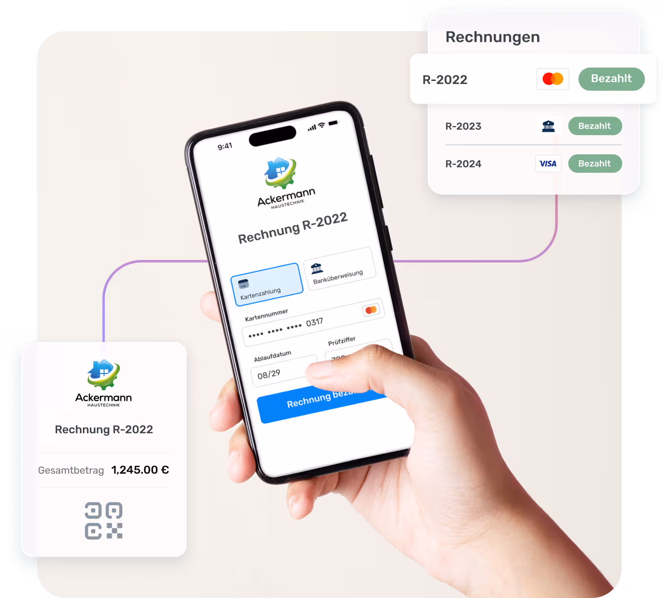Versendest Du eine Rechnung mit ToolTime Pay, können Deine Kunden eine Zahlungsseite öffnen – entweder via Link in der Rechnungs-E-Mail oder durch Scannen des QR-Codes auf der Rechnung.